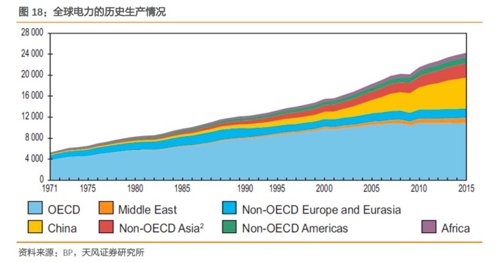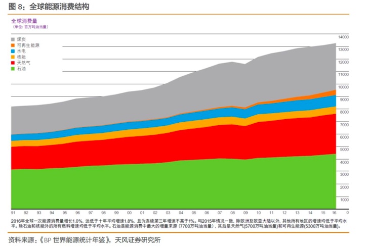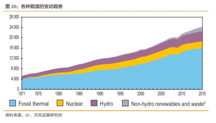 关注现象一:全球能源的需求结构明显的多样化,水电、核能乃至近10年来快速抬升的可再生能源占比分别都接近或者超过5%。其中尤以可再生能源的发展趋势最迅猛,而可再生能源其成本主要受制于技术,可以预见在技术不断改善的未来,其占比仍会趋势上升;