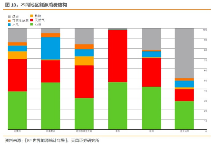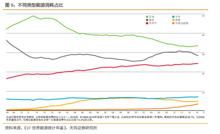 如果煤炭的消耗占比难以持续大幅下降,而天然气、可再生能源的使用又在趋势上行,那么原油的占比可能在趋势上仍将呈现出向下的情况,虽然短期内尚且没有一种能源能够撼动其首要地位。