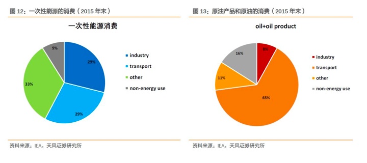 但是原油和原油产品的使用却明显不一样,“运输”是主要的消耗领域,占比达到65%,其次是“非能源使用”项(non-energyuse,原油作为原材料,而非燃料),占比大约16%。也就是说65%左右的原油都在交通运输中被消耗了。
