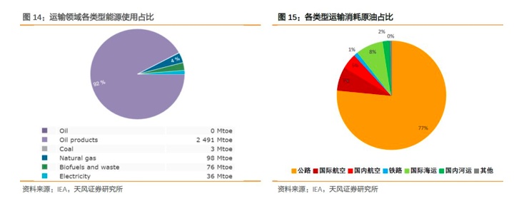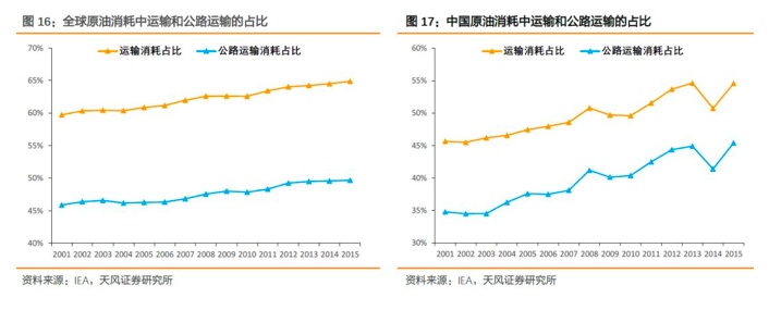 具体到运输领域内,公路运输是绝对占比项,达到了77%,也就意味着全球近50%左右的原油都在公路运输中被消耗。