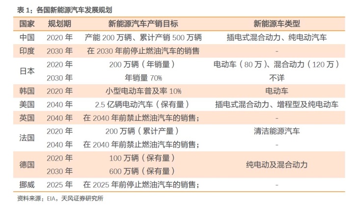 目前全球原油消耗的主要经济体都制定了新能源汽车发展规划,而这些新能源汽车按照规划来看:大部分是采用电力驱动的,另外一部分是采用新式能源(生物燃料等)。