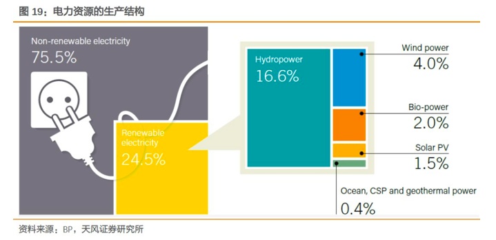 目前全球电力生产中,大部分是采用不可再生能源发电,可再生能源占比不足25%,主要的来源是水电和风电。