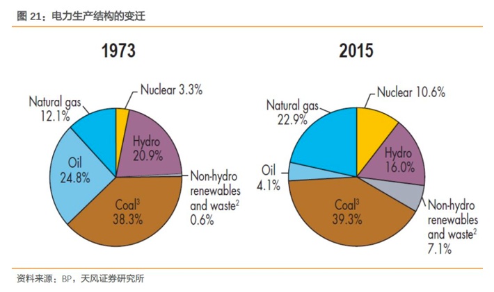 对比1973年到现在,用于发电的一次能源显著收缩的部分就是原油,从24.8%降至4.1%。