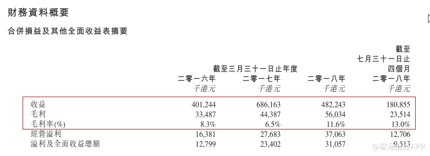 誉燊丰控股有限公2016年3月31日-2018年3月31日的收益分别为4.01亿港元、6.86亿港元和4.82亿港元,其毛利率分别为8.3%、6.5%和11.6%。