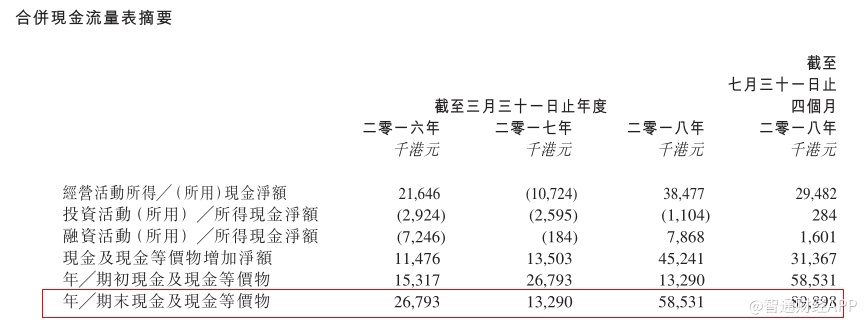 誉燊丰控股2016-2018财年的期末现金及现金等价物分别为2679万港元、1329万港元及5853万港元,可以看出相比前两年,2018财年的期末流动资金相对宽松。