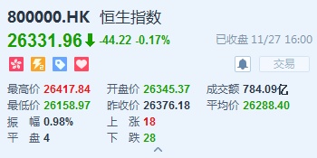 智通财经APP获悉,恒指早盘低开0.12%,报26345.37点。截至收盘,恒生指数跌44.22点或0.17%,报26331.96点,全日成交额达784.09亿。国企指数跌0.06%,报10515.3点,红筹指数跌0.8%,报4269.16点。