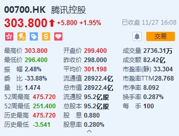 蓝筹股方面,腾讯(00700)收复300港元关口,盘中最高涨至303.8港元,截至收盘,涨1.95%,报303.8港元,全日成交额达82.42亿港元,贡献指数48点。
