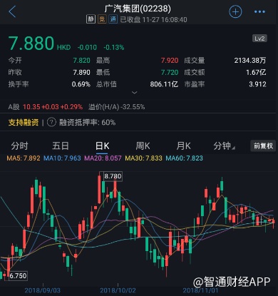 截至今日收盘,广汽集团(02238)报7.88港元,跌0.13%。
