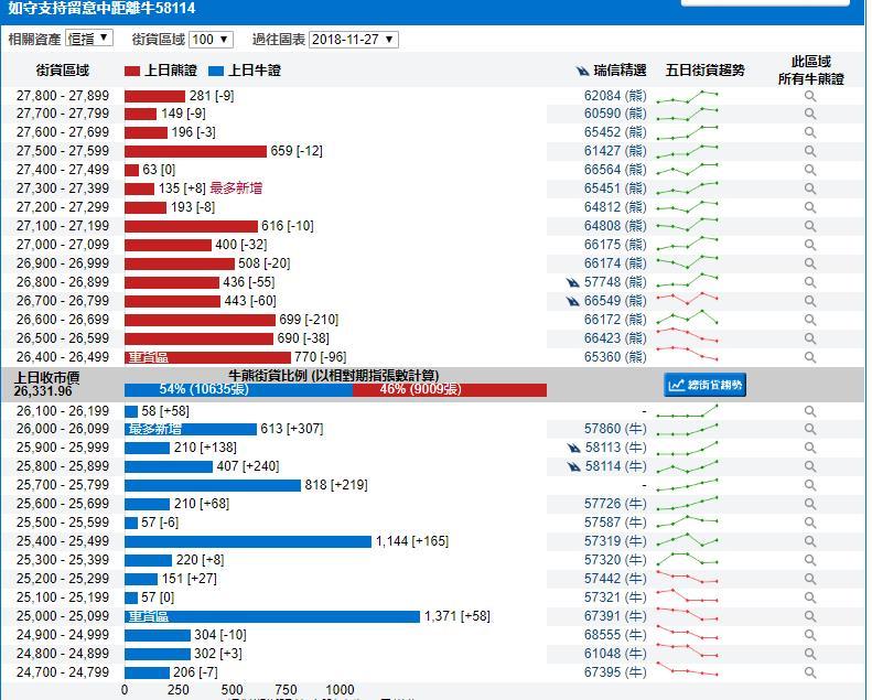 智通财经APP获悉,截至11月27日,恒指最新的牛熊街货比例54:46。从瑞信恒指牛熊证街货分布图中得到的数据显示,熊证街货重货区在26400-26499区间,该区间熊证数量为770张,比上一交易日减少96张;最多新增在27300-27399区间,新增8张。牛证中重货区在25000-25099区间,该区间最新牛证数量为1371张,比上一交易日增加58张;最多新增在26000-26099区间,新增307张。