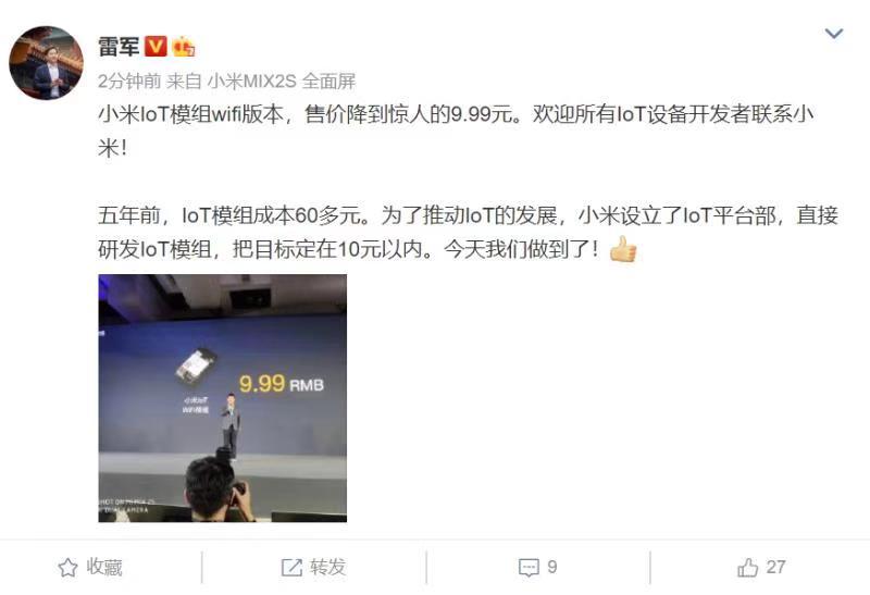 雷军也就此发布新浪微博表示,五年前,IoT模组成本60多元。为了推动IoT的发展,小米设立了IoT平台部,直接研发IoT模组,把目标定在10元以内。今天我们做到了!