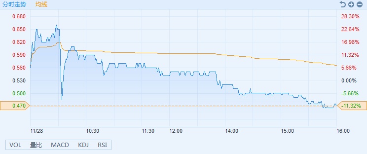 智通财经APP获悉,中国智能集团(00395)早盘股价大涨,尾盘股价倒跌。截至15时59分,跌11.32%,报价0.47港元,成交额3.44亿。