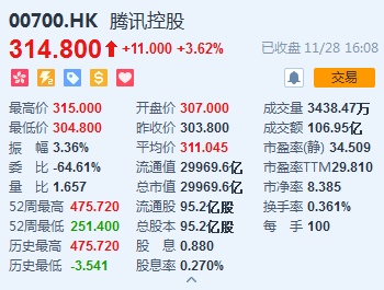 蓝筹股方面,腾讯(00700)强势拉升,截至收盘,涨3.62%,报314.8港元,全日成交额达106.95亿港元,贡献指数91点。