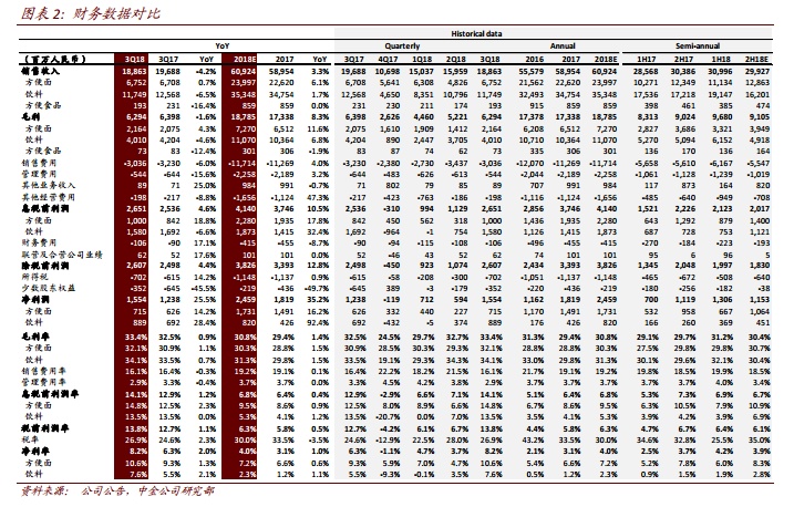 康师傅控股(00322)公布 3Q18 业绩:营业收入 188.6 亿, 同比跌 4.2%;净利润 15.5 亿, 同比涨 25.5%,对应每股盈利 0.28 元。 3Q 盈利同比增长 25.5%明显好于市场谨慎预期(因投资人担心销售同比下滑将会拖累盈利),但同期方便面盈利同比依然大幅增长 14.15%(虽然销售增幅下滑至不到 1%),饮料盈利(少数股东权益分配前)随因销售拖累而同比下滑 7.13%,但饮料持股比例提升 20 个百分点仍帮助饮料并表盈利同比大幅提升。同时, 3Q 两大业务毛利率同比升势继续,期间费用率依然受控良好,单季盈利增幅超预期。