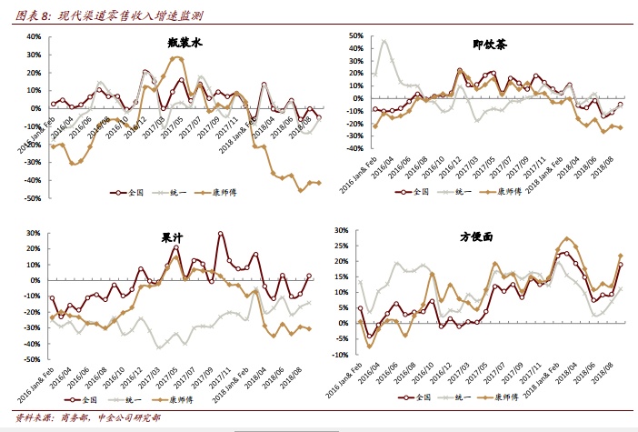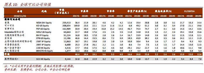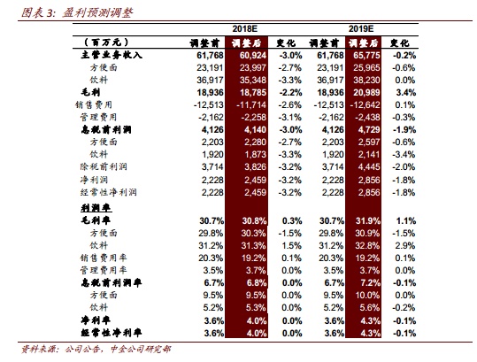 预计 4Q18 盈利同比跌幅会有所扩大,但全年盈利同比增 35%将是底线:前三季度方便面和饮料零售市占率下滑是事实,方便面市占率压力主要来自低线城市竞争,而饮料中水和茶饮料市占率下行压力则主要来自竞品冲击以及自身产品提价后的消化时间。尽管 4Q18 亏损额同比会有扩大,但公司表示全年盈利同比增长35%将是底线,且该底线未考虑 4Q18 可能录得的饮料厂转让收益。