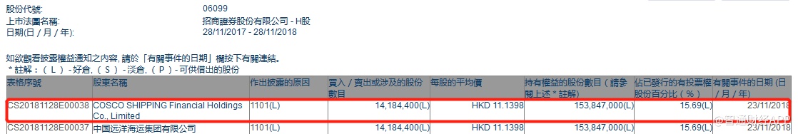 智通财经APP获悉,根据联交所资料显示,COSCO SHIPPING Financial Holdings Co., Ltd于11月23日增持招商证券(06099)1418万股,每股作价11.14港元,总值1.58亿港元,最新持股量增至15.69%。