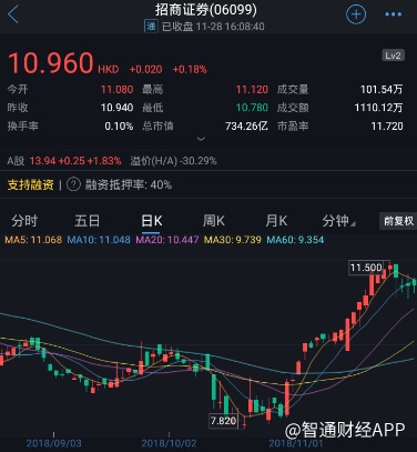 截至今日收盘,招商证券(06099)报10.96港元,涨0.18%。