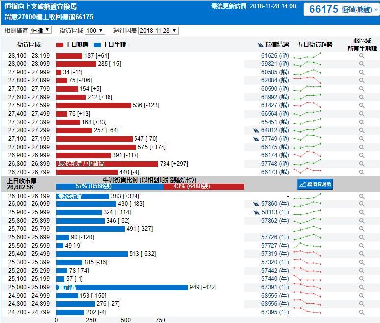智通财经APP获悉,截至11月27日,恒指最新的牛熊街货比例57:43。从瑞信恒指牛熊证街货分布图中得到的数据显示,熊证街货重货区在26800-26899区间,该区间熊证数量为734张,比上一交易日增加297张;最多新增在同一区间。牛证中重货区在25000-25099区间,该区间最新牛证数量为949张,比上一交易日减少422张;最多新增在26100-26199区间,新增324张。
