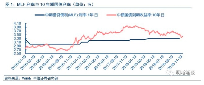 3.3%的MLF利率水平约束了10年国债利率下行,10年国债利率又对信用债利率产生了一定的约束。自2018年4月份以来,1年期MLF利率保持在3.3%,10年期国债利率最低时曾降至3.35%,目前已小幅上行至3.39%,MLF利率继续对10年中债国债到期收益率形成底部波动约束。2017年下半年开始,央行先后四次上调MLF利率,目前已处于较高水平未来有一定的下调空间。此外,一方面,考虑到实体企业融资成本高仍是短期内导致经济承压的因素之一,另一方面,为了加强MLF作为政策利率的引导作用增强央行对市场利率的调控能力,未来央行将会适度下调MLF利率。