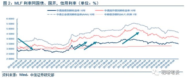 历史上曾出现过MLF与10年国债倒挂的现象,但随着MLF指引信号的加强,近年来上述反常现象未曾出现,MLF对利率托底的作用增强。通过下图我们可以发现MLF利率同国债、国开、信用利率显现出一定的正相关关系,2017年2月、4月以及2018年4月MLF利率的几次上调均托动了利率的上行,利率下行的重要前提条件就是银行负债端的成本下行,而MLF利率的下调直接影响商业银行中长期的负债成本。