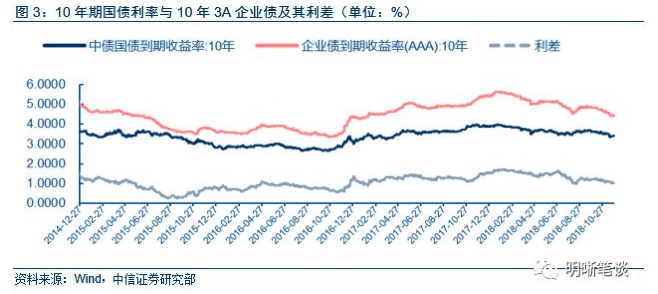 10年期国债利率与10年3A企业债4年平均利差为106BP,通过图2我们可以判断,10年期国债利率与同期3A企业债在窄区间内波动。事实上,在2018年内,二者利差长期稳定在100BP至170BP区间内。在此条件下国债利率对信用债利率仍具有较强约束作用。