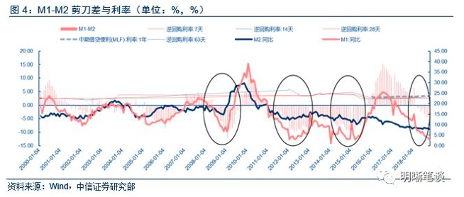 M1与M2的剪刀差一般产生于企业经营活力增长时期,2018年剪刀差的消失意味着企业经营活力的下降,将对经济增长形成拖累效应。回归当下,在目前经济下行压力大背景下,同前述阶段类似,M1-M2为负值且已经持续一段时间,反映企业投资需求不振,针对稳增长及支持小微民营企业的立场,未来降息可期。