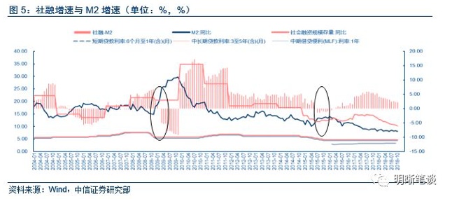 从走势上来看,社融-M2增速差与货币政策具有一定正相关关系,表现为降息和降准期间,社融-M2增速差也在收窄。我们在此前的《债市启明系列20181102—社融和M2对利率的指示作用如何?信用与货币分歧还在加大吗?》曾指出,社融-M2增速差的拐点领先于降息和降准的时点。这可以理解为信用收缩期社会融资不畅,信托贷款、直接融资等资金流动减缓,因此社融较M2回落更快,因此社融-M2差值收窄,如2013年初至2015年上半年期间,表面上看是经济下行和股灾促发央行开启宽松政策,但反过来看,正是信用过快收缩导致经济下行,过多的货币涌入股市推高泡沫,因此信用相对货币收缩过快更像是二者的因,货币政策的滞后反应则是缓解信用收缩的逆势调控。