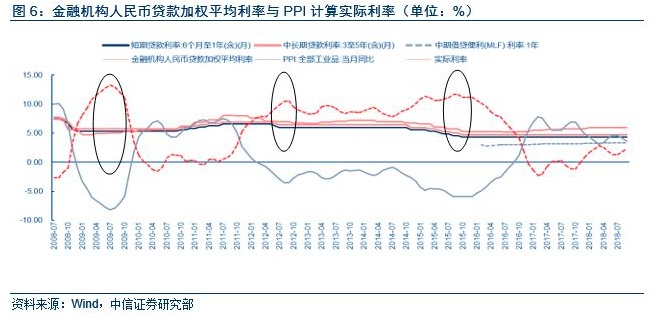 PPI在各国货币政策中往往不受关注但实际利率与央行的货币政策却有着较高的相关性。PPI不受关注主要缘于PPI较大且向CPI传导过程中有着诸多障碍以及明显时间滞后性。但在计算工业企业实际利率时,为剔除掉价格因素影响,我们用金融机构人民币贷款加权平均利率与PPI当月同比差值近似作为工业企业实际利率。值得注意的是,世界银行采用的计算实际贷款利率的方式为金融机构人民币贷款加权平均利率与GDP缩减指数做差,一个可能的考虑是第一种计算方式中只考虑工业品出厂价格因素对于利率的影响,事实上原材料价格在一定程度上也存在价格波动。