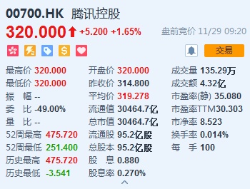 蓝筹方面,腾讯(00700)早盘高开1.65%,报320港元,大市盘前成交额为4.32亿港元。