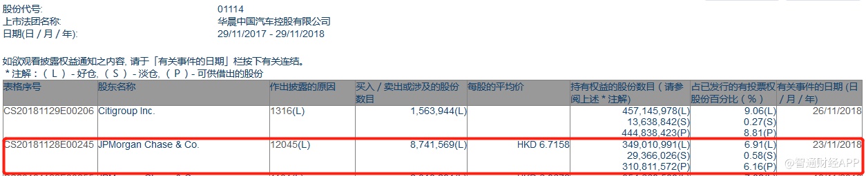 智通财经APP获悉,根据联交所资料显示,摩根大通于11月23日减持华晨中国(01114)874万股,每股作价6.7港元,总值约5855.8万港元,最新持股量减至6.91%。
