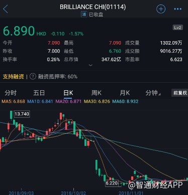 截至今日收盘,华晨中国(01114)报6.890港元,跌1.57%。