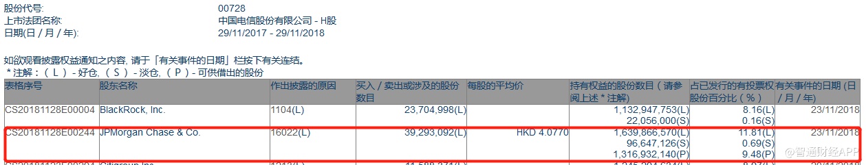 智通财经APP获悉,根据联交所资料显示,摩根大通于11月23日减持中国电信(00728)3929万股,每股作价4.07港元,总值约1.6亿港元,最新持股量减至11.81%。