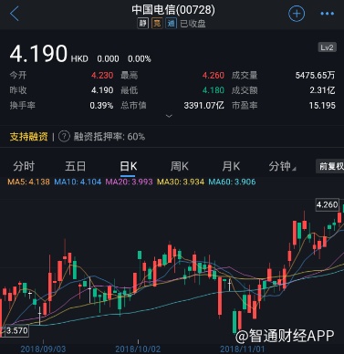 截至今日收盘,中国电信(00728)报4.19港元,无涨跌。