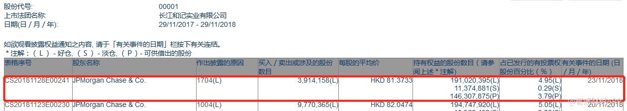 智通财经APP获悉,根据联交所资料显示,摩根大通于11月23日减持长和(00001)391万股,每股作价81.37港元,总值约3.19亿港元,最新持股量减至4.95%。
