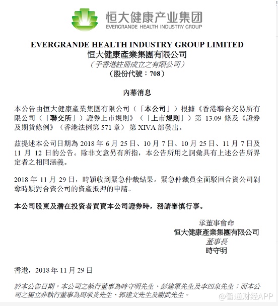 智通财经APP获悉,11月29日,恒大健康(00708)发布公告,香港国际仲裁中心全面驳回了贾跃亭再次要求剥夺恒大资产抵押权的申请,这意味着贾跃亭通过抵押资产掏空FF的图谋再次落空。