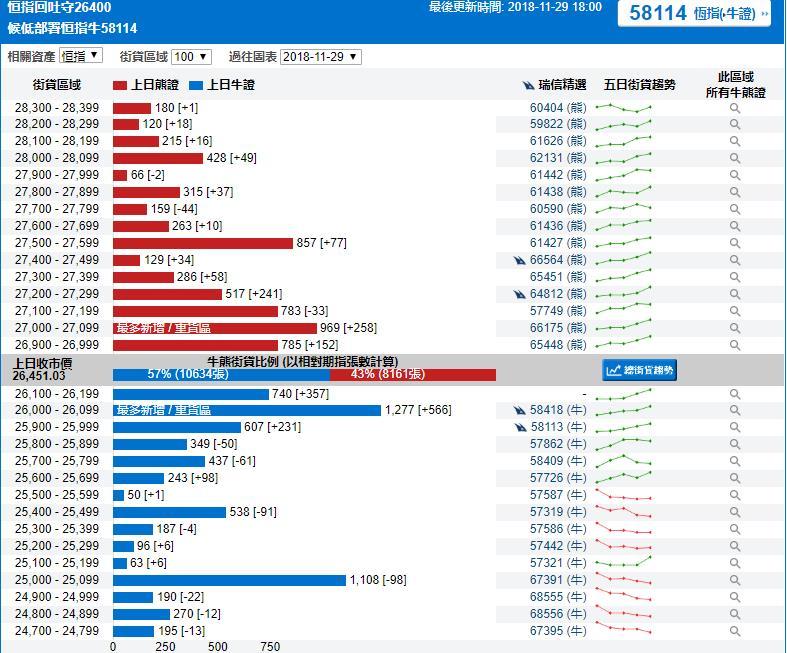 智通财经APP获悉,截至11月29日,恒指最新的牛熊街货比例57:43。从瑞信恒指牛熊证街货分布图中得到的数据显示,熊证街货重货区在27000-27099区间,该区间熊证数量为969张,比上一交易日增加258张;最多新增在同一区间。牛证中重货区在26000-26099区间,该区间最新牛证数量为1277张,比上一交易日增加566张;最多新增在同一区间。