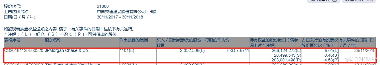 智通财经APP获悉,根据联交所资料显示,摩根大通于11月26日增持中国交通建设(01800)235万股,每股作价7.67港元,总值约1802.45万港元,最新持股量增至6.01%。
