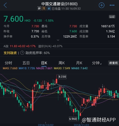 截至今日收盘,中国交通建设(01800)报7.60港元,跌1.55%。