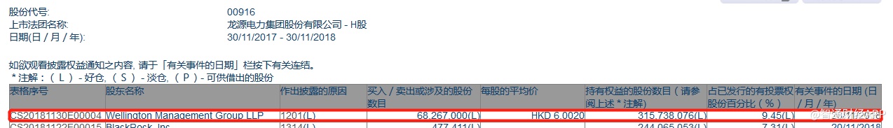 智通财经APP获悉,根据联交所资料显示,威灵顿资产管理于11月28日减持龙源电力(00916)6826万股,每股作价6.00港元,总值约4.095亿港元,最新持股量减至9.45%。