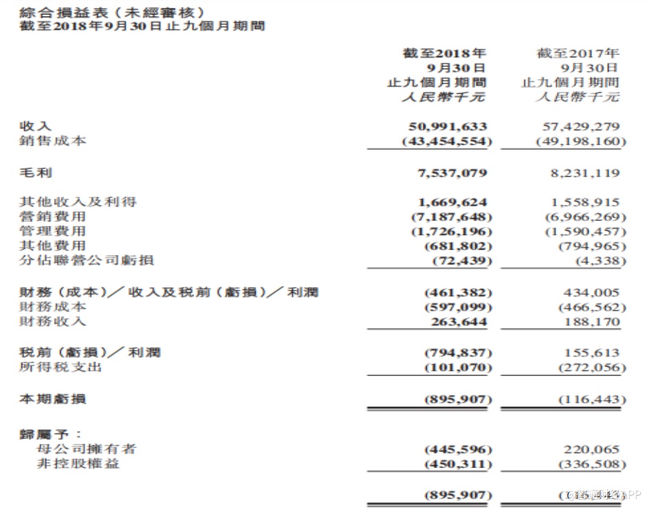 具体到业绩端,集团期内实现营收509.9亿元人民币(单位下同),同比下降11.2%至;综合毛利率同比提升1个百分点至18.1%,同比提升1.1个百分点,环比提升0.8个百分点。归属于母公司拥有者应占亏损为4.5亿元。