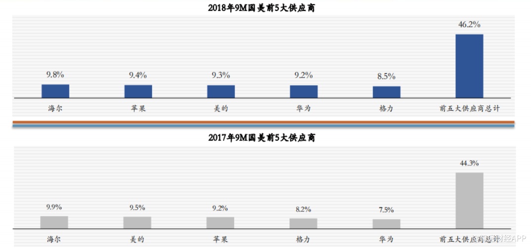 随着国美业务范围扩大,集团供应商体系也在优化之中。2018年前三季度,国美前5大供应商中,非家电品牌的比重在提升。