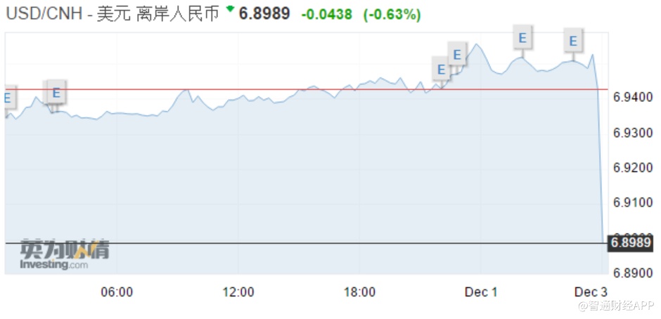 智通财经APP获悉,周末中美元首会晤后,双方决定停止升级关税等贸易限制措施。周一离岸人民币兑美元跳空高开150个点后持续拉升,截至目前日内累涨438点,报6.8989,收复6.9关口。
