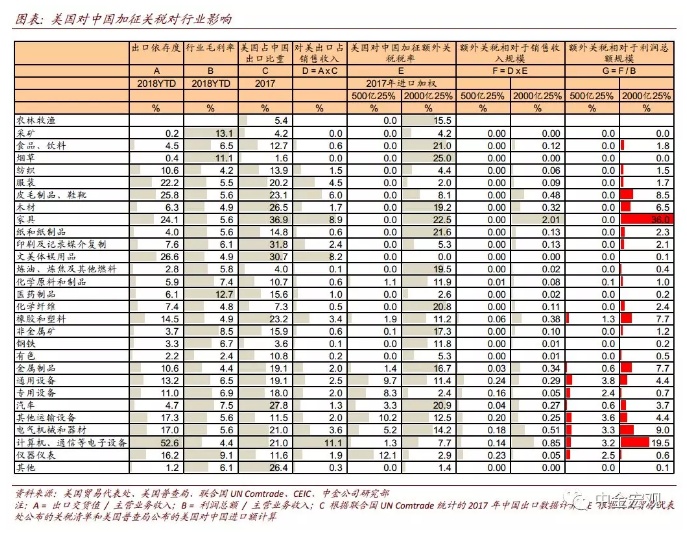 家具、电子、机械等受2000亿美元商品关税潜在冲击较大的行业风险降低或减缓。我们将美国对中国进口,按照中国国民经济行业分类进行归类,发现500亿美元商品关税主要集中在通用设备、专用设备、运输设备、仪器仪表等少数几个行业。而2000亿美元商品关税覆盖行业更多更广,如果征收25%的关税,半数以上制造业行业对美出口平均税率将提升10个百分点以上。结合美国占中国出口份额,以及各行业的出口依存度,我们发现,家具、电子、机械等行业受2000亿美元商品关税影响较大。如果2000亿美元商品关税不进一步提高,这些行业受到的潜在冲击将明显减轻或是延迟。