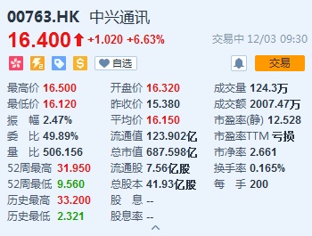 截至9时30分,中兴通讯(00763)涨6.63%,报价16.4港元。