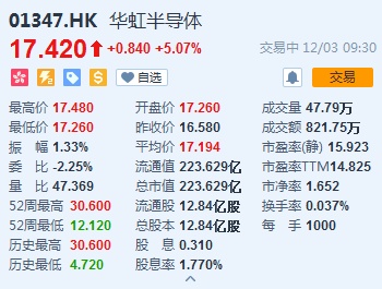 华虹半导体(01347)涨5.07%,报17.42港元。