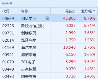智通财经APP获悉,家电股全线反弹,创科实业(00669)领涨板块。截至10时12分,创科实业(00669)涨8.79%,报价45.8港元,创维数码(00751)涨3.65%,报1.99港元,海尔电器(00921)涨1.76%,报18.54港元。