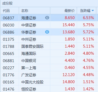 智通财经APP获悉,中资券商股全线大涨,截至10时32分,板块累计涨幅达5.34%。截至10时32分,海通证券(06837)涨6.53%,报价8.65港元,中信证券(06030)涨5.75%,报15.44港元,华泰证券(06886)涨5.72%,国泰君安国际(01788)涨5.11%,报1.44港元。