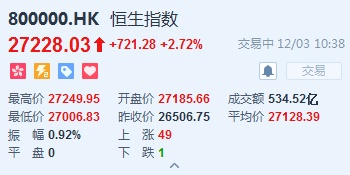 智通财经APP获悉,中美贸易关系迎关键性进展,恒指涨幅持续扩大,截至10时38分,恒指涨721.28点或2.72%,报27228.03点,成交额达534.52亿港元。