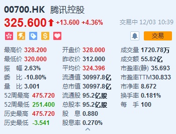 截至10时39分,腾讯(00700)涨4.36%,报325.6港元,报55.82亿港元,贡献指数112点。