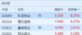 智通财经APP获悉,G20峰会传利好,在岸人民币收复6.93关口,截至11时42分,玖龙纸业(02689)涨8.2%,报价8.58港元,理文纸业(02314)涨4.37%,报7.4港元,晨鸣纸业(01812)涨2.63%,报4.69港元,阳光纸业(02002)涨2.19%,报1.4港元。
