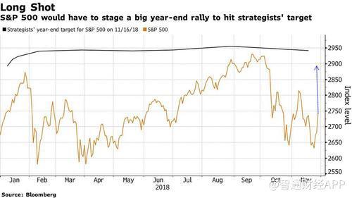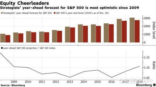 根据统计,14个机构对于2019年的预测中,截至11月30日的平均预测值,到明年年底,标普500指数将上涨11%,至3056点。尽管预测路径的陡峭程度在一定程度上反映了自去年9月以来股市遭遇的跌幅,但这是自2009年牛市开始以来最乐观的预测。